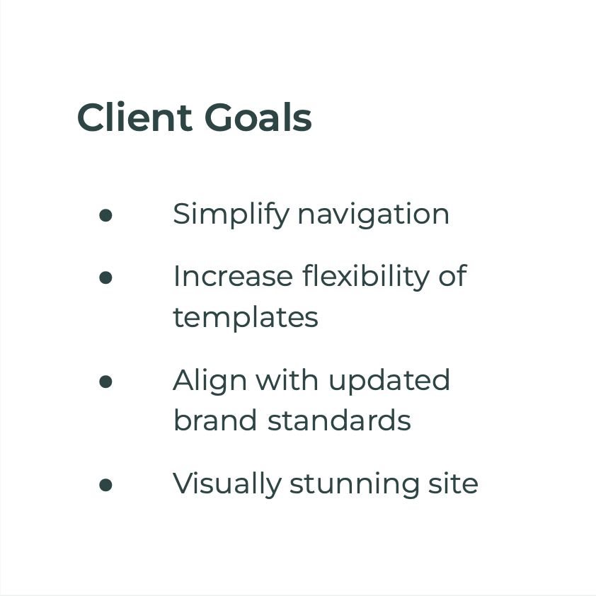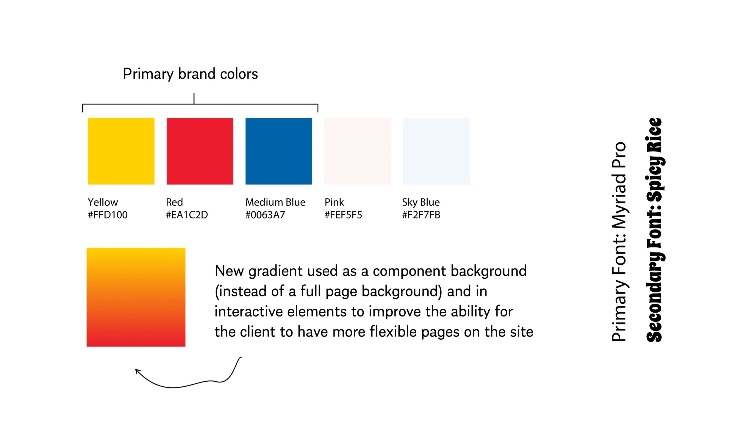 His second point struck a chord with me. One of the client’s major asks was to have a flexible site. If the gradient approach limited template flexibility, it would not be useful for the client. I chose not to go in the direction of color blocking initially because of the types of colors in the brand guide. Also, adding more white was not a solution that harmonized well with the styles I had already established. The group’s creative director supported my continuing on with the concept I was already working with, or going in a new direction. So I opted for the latter.